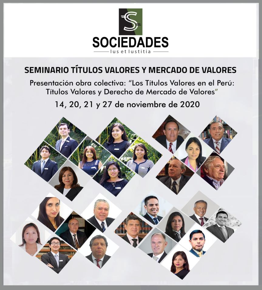 Grupo de Estudios Sociedades y Boletín Sociedades presentan su tercera obra colectiva editada por el Instituto Pacífico- Actualidad Civil, 2020, mediante el seminario Títulos valores y mercado de valores que se realizará por la plataforma Zoom en noviembre del presente año.