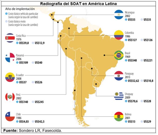 A la fecha, la aplicación del SOAT se ha generalizado a lo largo de diversos países sudamericanos como Nicaragua, Panamá, Ecuador, Paraguay, Uruguay, etc. (5) Presentando matices de seguro de responsabilidad civil y seguro de accidentes personales, como es el caso peruano.